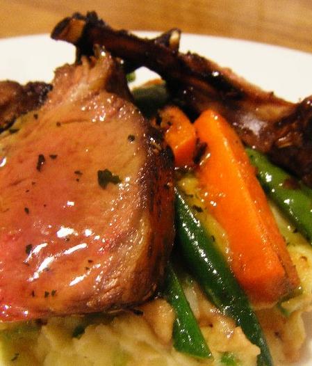 To serve: Serve the vegetables on bed of mashed potatoes, top with lamb racks and drizzle mint sauce on top of the meat.