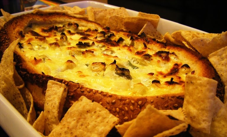 Break bread and top which has been cut of loaf into 2-3cm pieces 10 mins before the cheese dip is ready to be removed from oven.