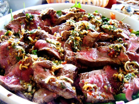 - Put the salad leaves, onion, coriander leaves, mint, tomatoes and cucumber in a large bowl, add the beef and dressing, toss them together and serve immediately.