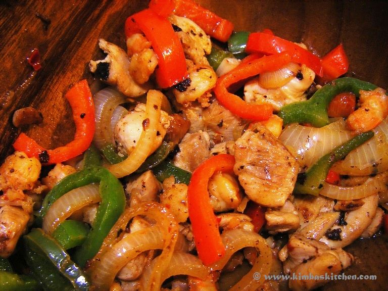 In a wok, fry the chicken until it browns, add prawns and continue frying until both chicken and prawns are cooked. Add onions, capsicums, and season well with lemon juice, soy sauce, fish sauce, chilli and pepper. Set aside as a pre-cooked filling, ready to be added into the pancake.