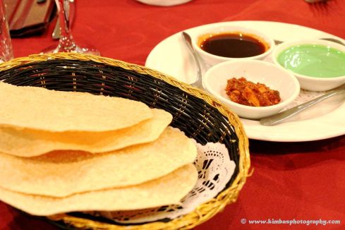 As soon as we were seated, our waiter (or should I say waiters, as they were 3 waiters on duty and only 4 tables filled!) brought out some papadums for us to nibble on as we decide what to order.