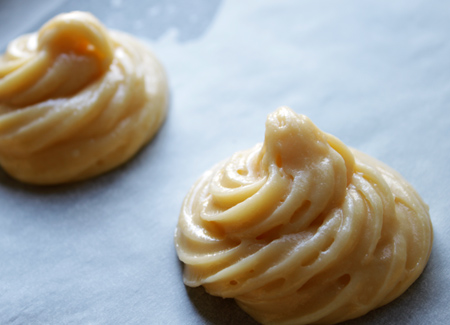 4. Pipe the mixture onto the prepared trays. Bake for 20 minutes or until the balls are puffed. Reduce the oven to 180º and bake for another 10 minutes until the puffs are golden brown and crisp.