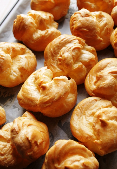4. Pipe the mixture onto the prepared trays. Bake for 20 minutes or until the balls are puffed. Reduce the oven to 180º and bake for another 10 minutes until the puffs are golden brown and crisp.