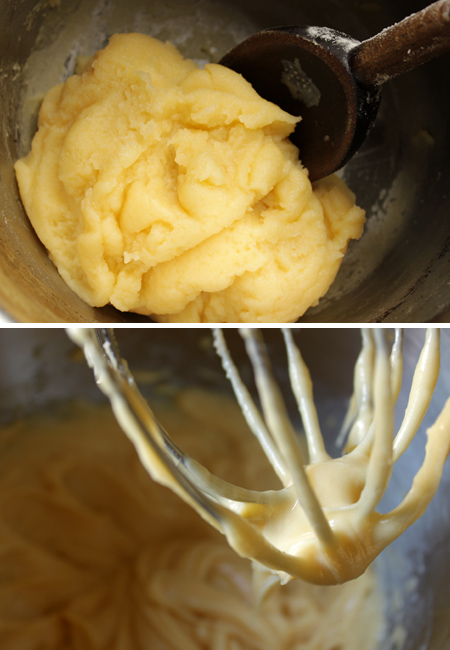 3. Transfer the mixture to a bowl and set aside to cool. Using electric beaters, beat in the eggs, one at a time until the mixture is thick and glossy.
