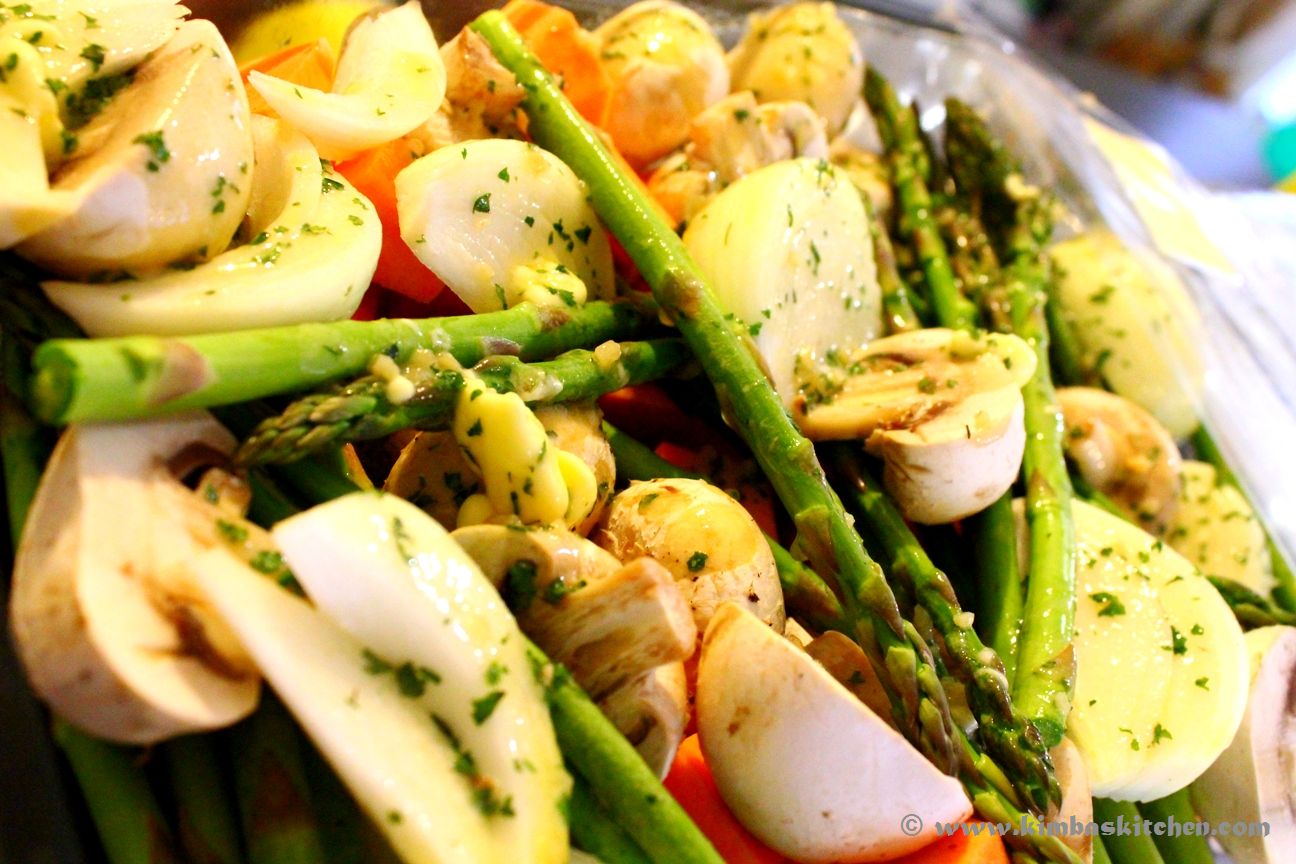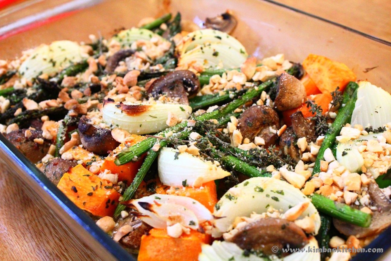 Roast Vegetables consisted of Sweet Potatoes, Mushrooms, Onions and Asparagus in Garlic Butter, Thyme and Toasted Cashews.