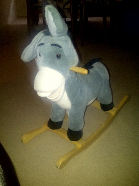 First baby toy purchased – a cute little rocking donkey from a garage sale only $5!
