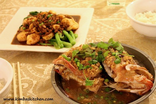 A wonderful home cooked meal – Steamed Fish Head with Ginger and Japanese Tofu and Chinese Vegetables with Minced Pork in Oyster Sauce – serve dishes with rice. Mm mmm!