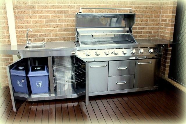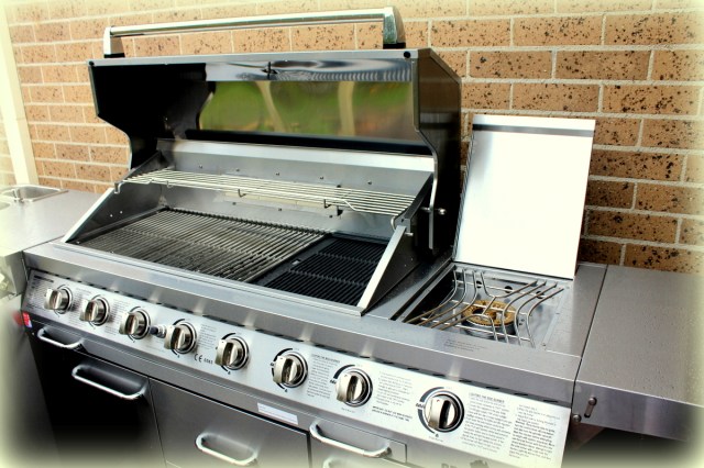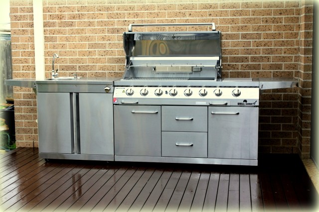 We’re really happy with it especially how it looks and perfectly fits in that corner of the decking. It comes with a 6-burner as well as a wok burner thing on the side, a sink, plenty of storage space underneath, and lots of preparation and bench space. It is stainless steel with a cast iron grill plate.