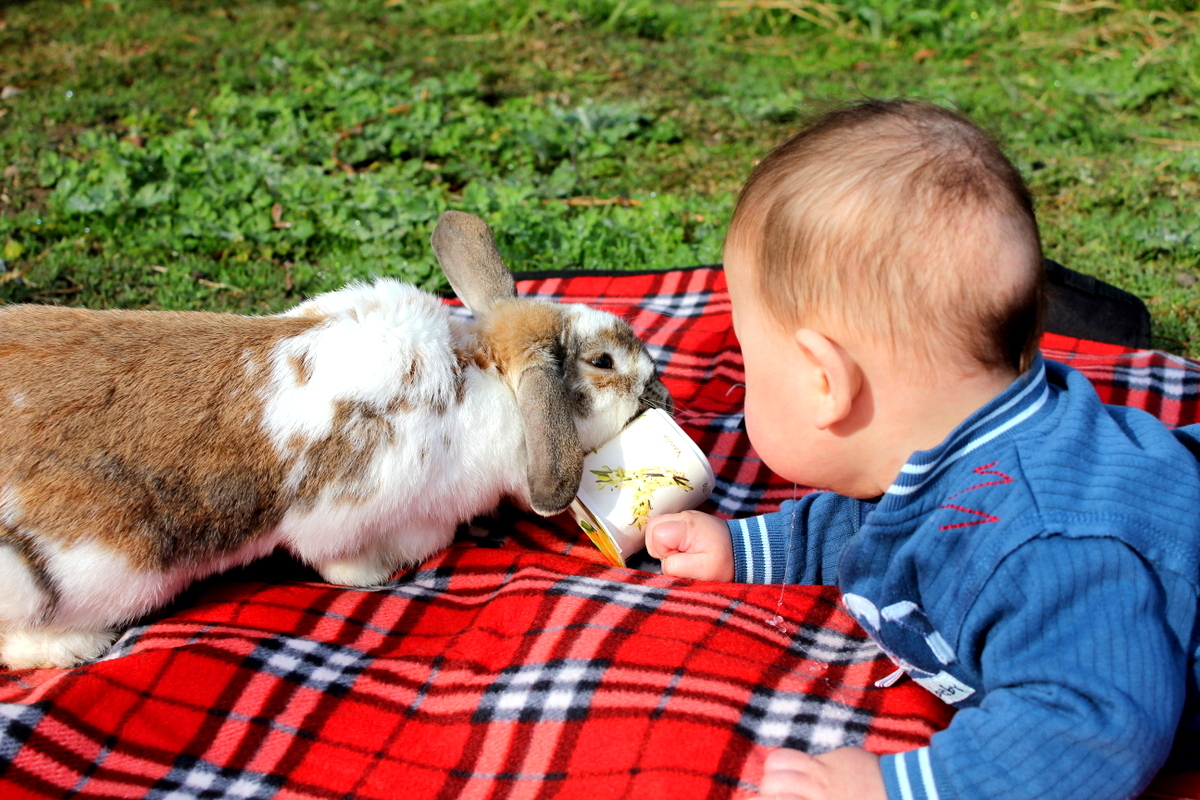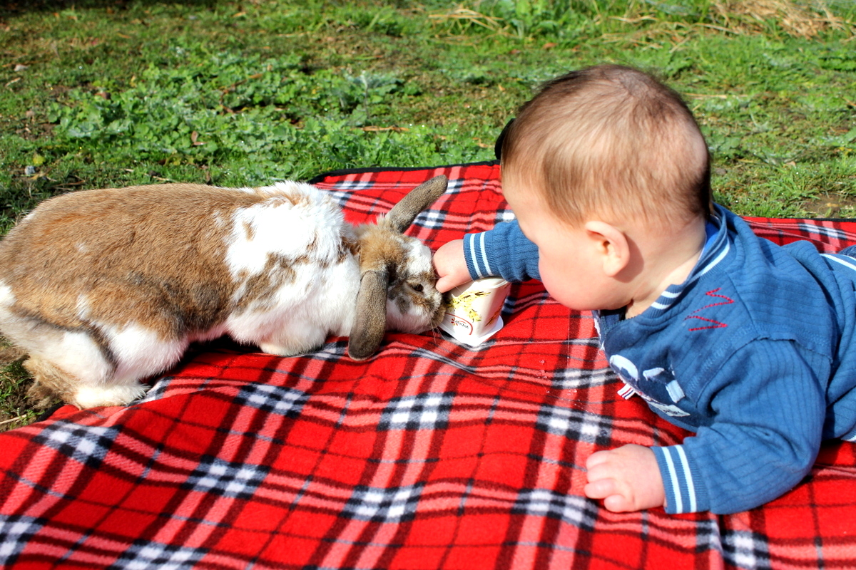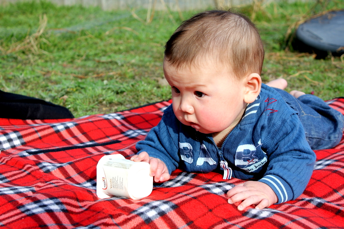 Micah rolling around the picnic rug with a small tub of yoghurt