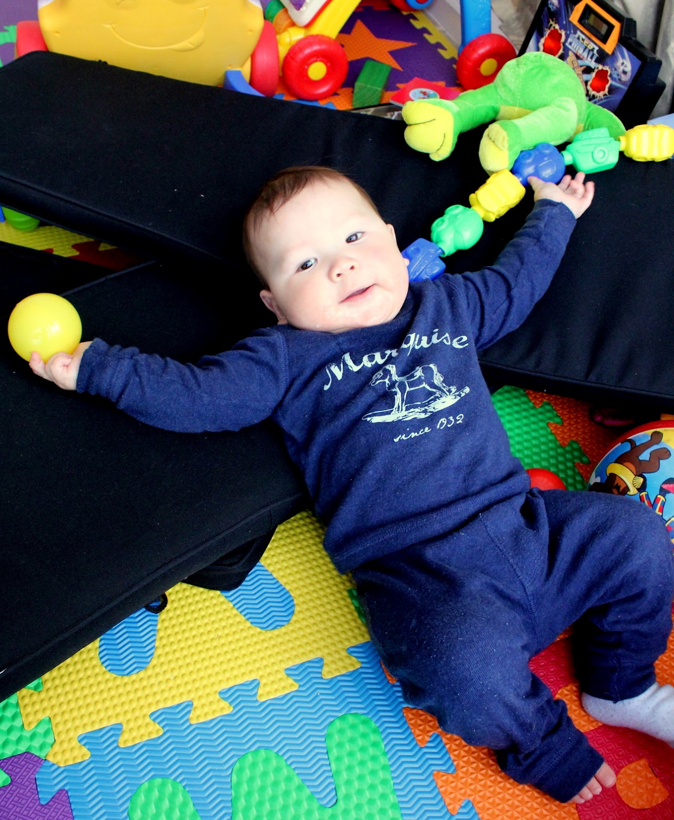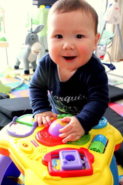 His play activities have changed dramatically. He used to love just crawling around from one toy to another, putting everything in his mouth along the way. Now, he just chooses one toy, usually a walker or an activity table, climbs on it and stands up, and just stays there for a while. He loves learning to balance, and he is learning very quickly!!!