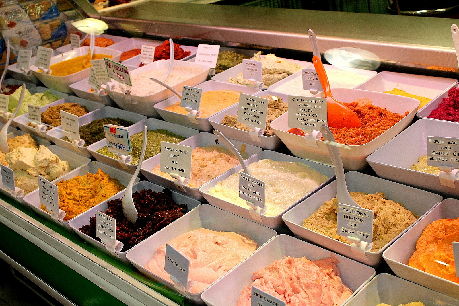 The first thing I tried was the Date and Pistacio Balls, deliciously sweet and soft and apparently goes really well with cheese and crackers for afternoon tea. Also tried some deliciously fluffy homemade Turkish Delight. I thought that was pretty good already, until they got me to try some of their homemade dips…..