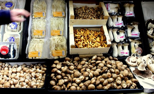 A selection of delightful mushrooms at Damian Pike – the ones in the wooden boxes are the expensive ones! Mouserron (Top) and Chanterelles (Bottom) both $150/kg!