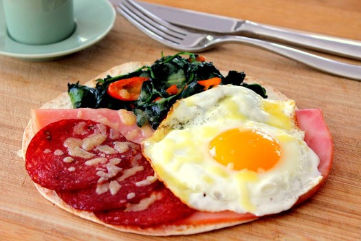I stayed fairly true to the recipe, except I added some hot salami and used grated cheese instead of the block of cheddar. I also completely used only the oven to heat up the tortillas and cook everything else as if I was making a mini pizza. The result: AWESOME! It was a bit of a “manly” dish, with the saltiness of the ham and heat from the salami. The fried egg was perfect to add the “gooey” factor to the dish. It was also easier to eat the whole thing by hand, by folding the tortilla and just creating a gooey but delicious mess!
