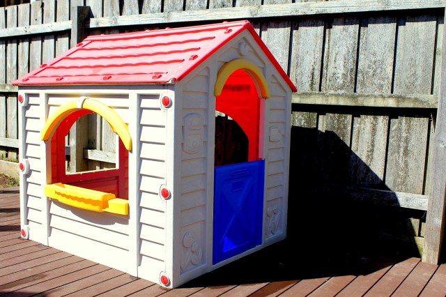 A few weeks ago, as I was driving home from possibly shopping, I saw a little cubby house looking sad and lonely on the roadside outside our neighbour’s house two houses away. I decided I’d stop to have a look, and it was a perfectly good cubby house! Yes, the paint has faded due to sun damage, and there are a few minor plastic cracks but nothing that would actually damage the structural integrity of the cubby house!