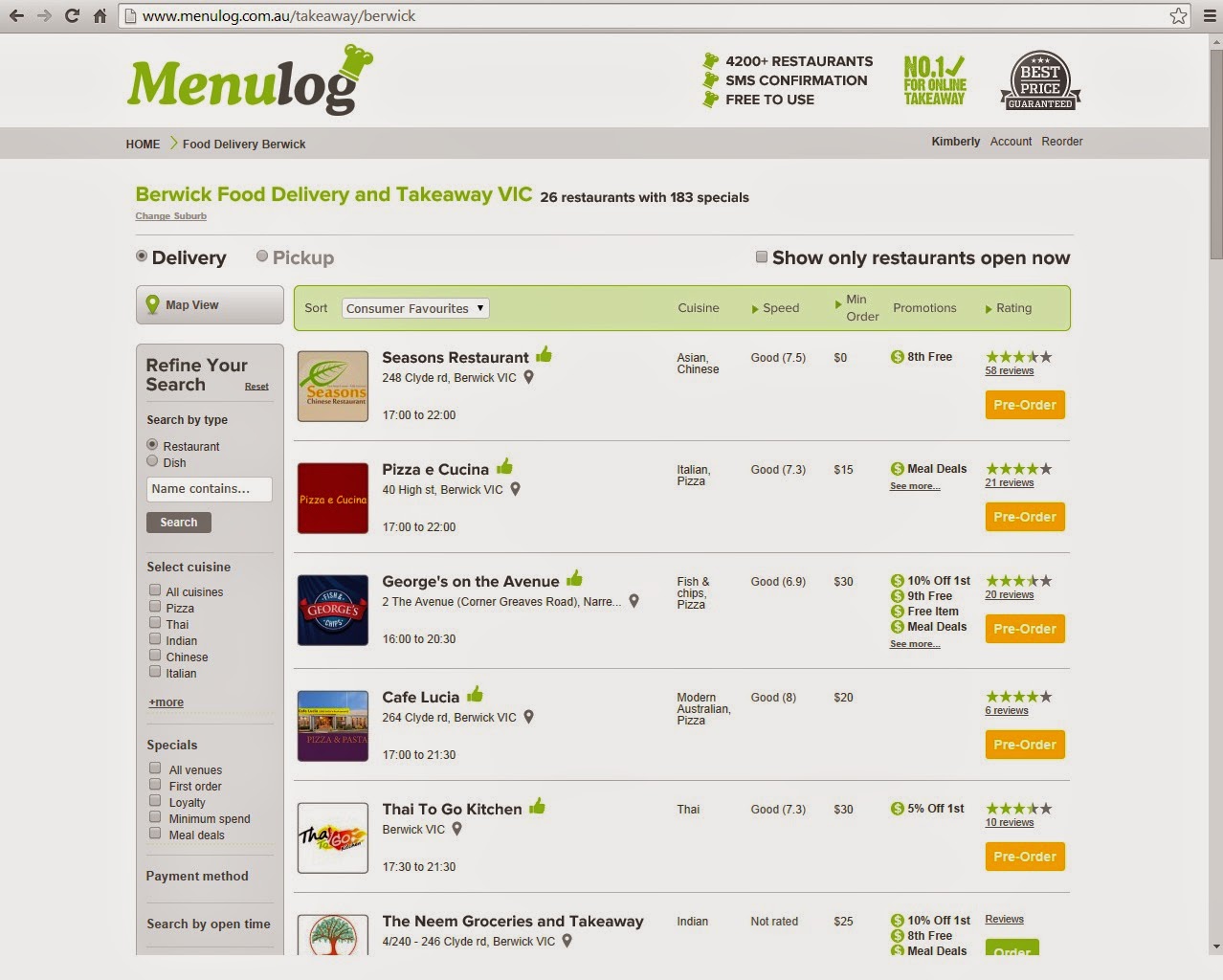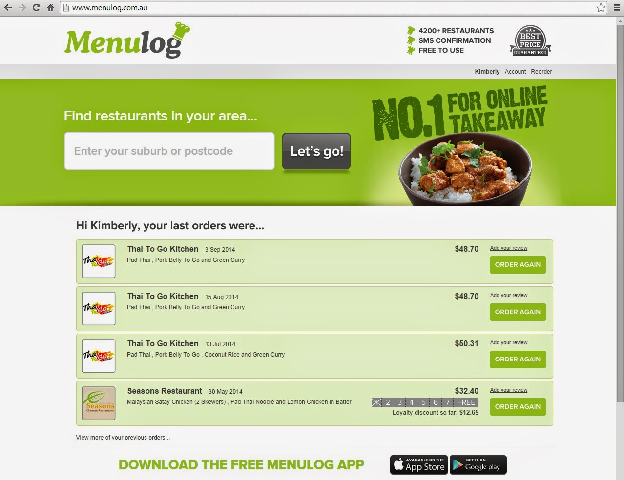Go to www.menulog.com.au to get started. If you already have an existing account and have ordered takeaway from the website before, a list of your previous orders would appear on the homepage so you can conveniently and quickly re-order your favorite meals with one click of a button. If you are new, you can start searching for restaurants in the area by entering your postcode.