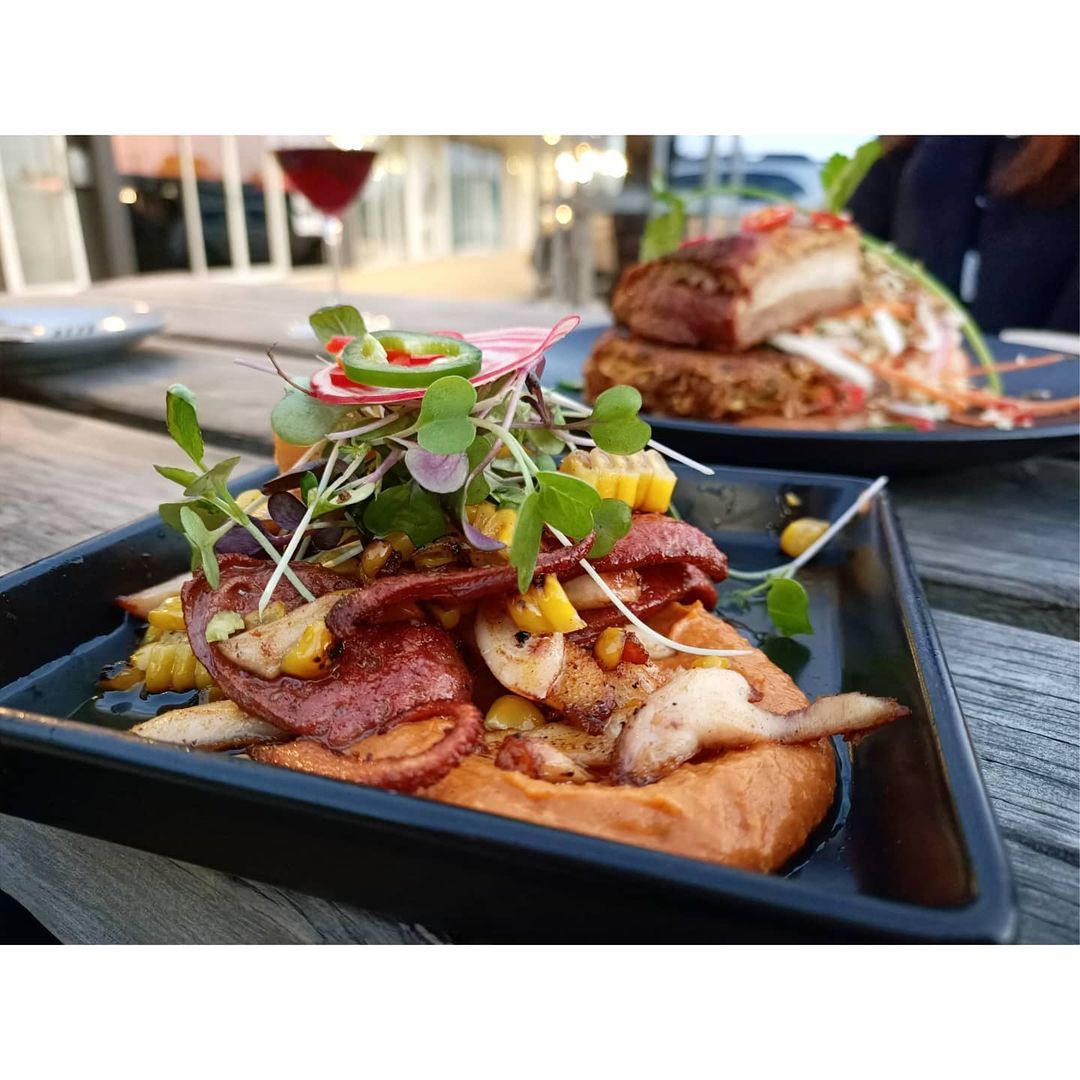 Soon after, we went to Beach HQ Restaurant and Bar in Cowes for our entree. Yes, this whole “progressive dinner” thing was becoming a thing for us! We each had a drink and shared the Snack Platter which had crispy haloumi, salt and pepper calamari, pork belly with slaw and chilli glaze, hot sticky chicken tenderloins and thick chips. It was a great platter with very tasty choices, and perfect for sharing!