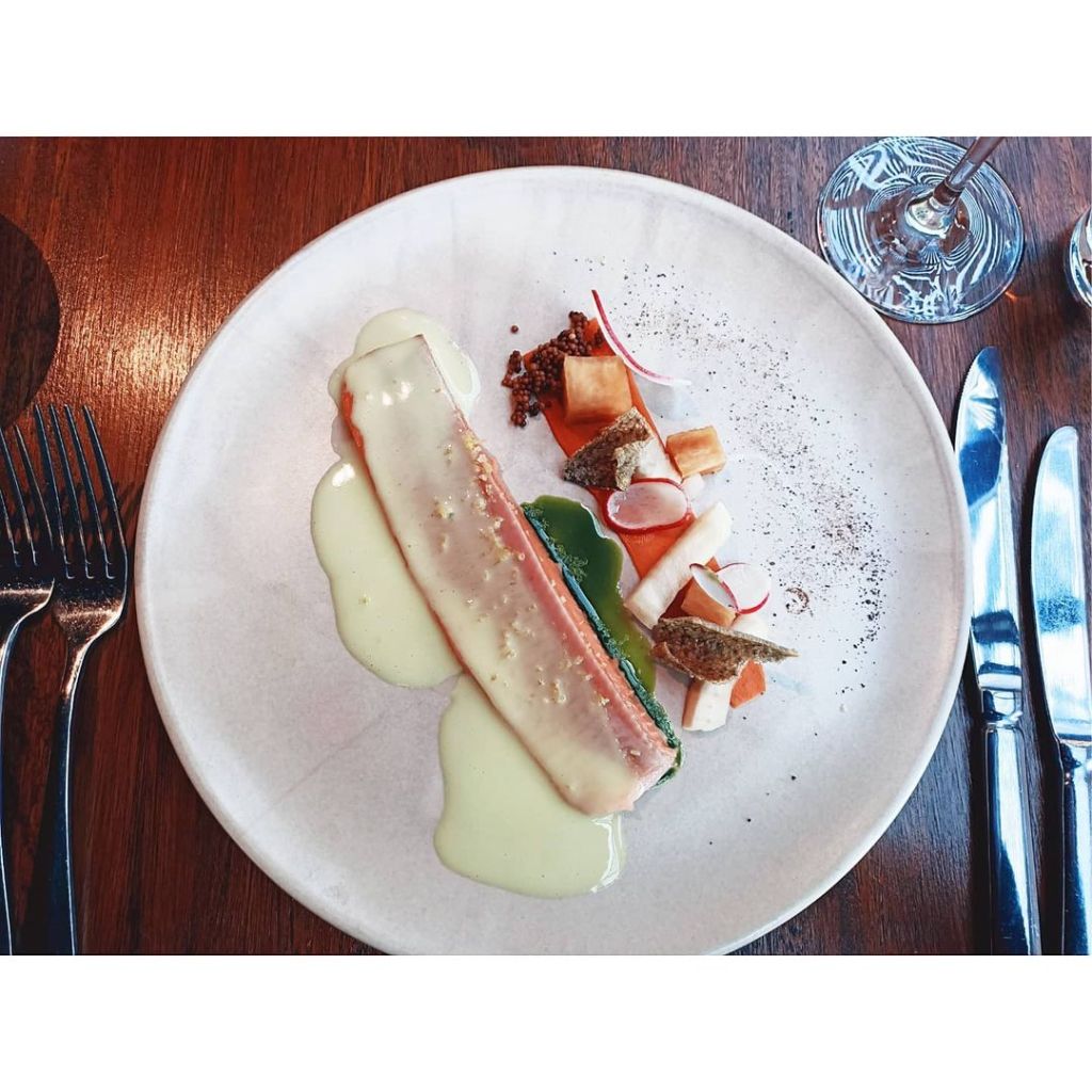 The 4-course set menu was $95 pp which included spelt sourdough with hummus and snacks, cauliflower with fetta and potato, Buxton trout w chardonnay and mustard, Cape Grim eye fillet with daikon, vegetable jus and dill and finished with a delicious chocolate, rhubarb and hazelnut dessert.