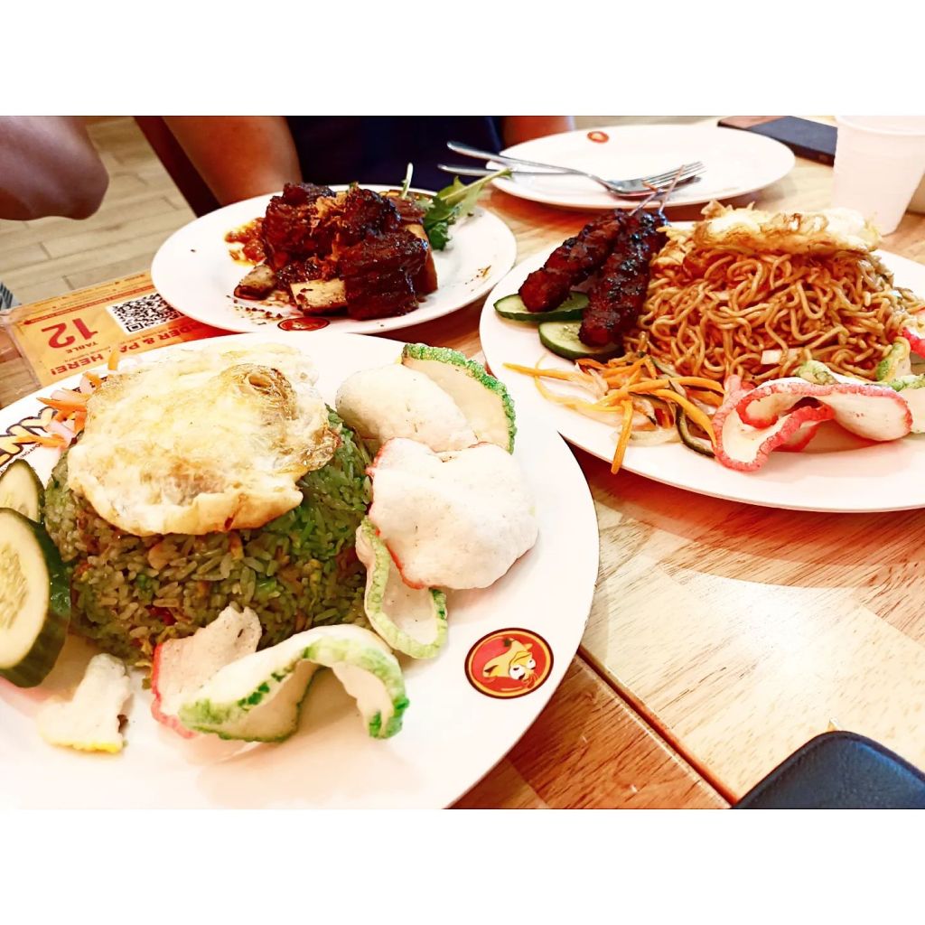 Left to Right: Ayam Penyet, Ikan Bakar, Grilled Beef Ribs, Eggplant Chilli, Chicken Satay, Nasi Goreng, Mee Goreng, Salted Egg Prawns, Salted Egg Squid, Pisang Goreng and Cendol.