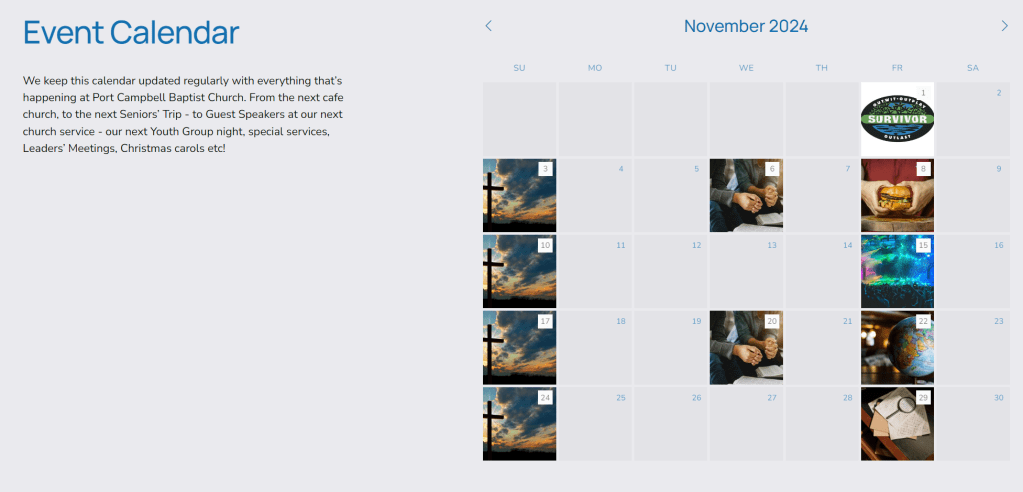 - The Event Calendar feature was a nice touch for an overall view of all upcoming church services (and details on the topic and speaker that day etc) and prayer meetings and Youth Group nights etc.